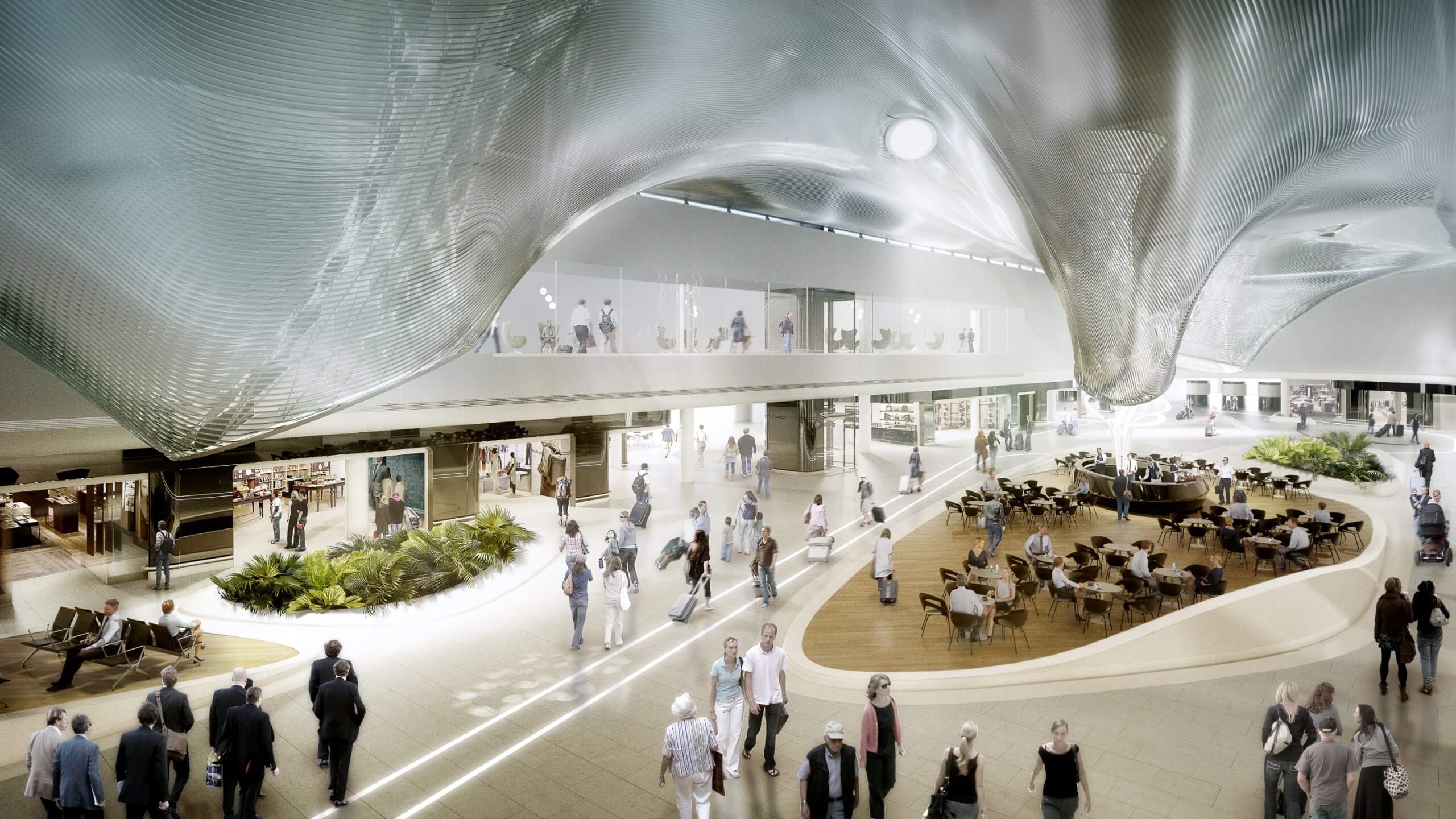 Bis zu elf Flugzeuge können gleichzeitig abgefertigt werden. Die Gate-Bereiche umfassen 6.000 Sitzplätze. 60 Läden und Restaurants verteilen